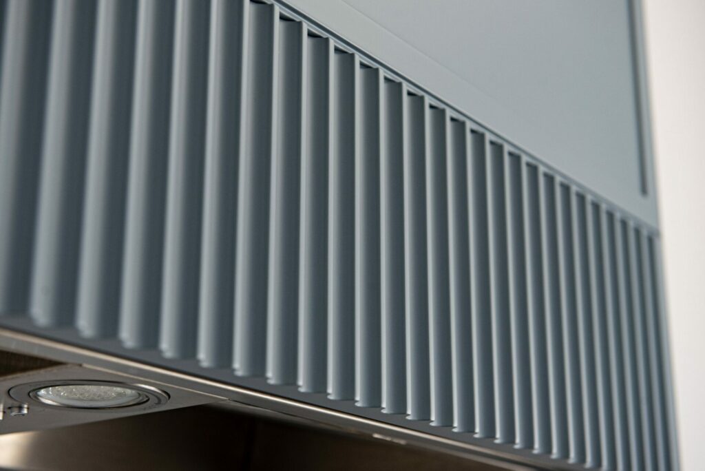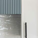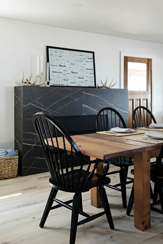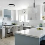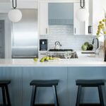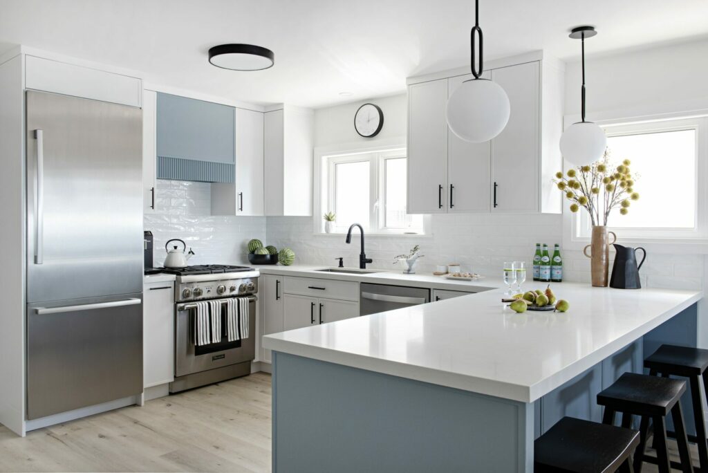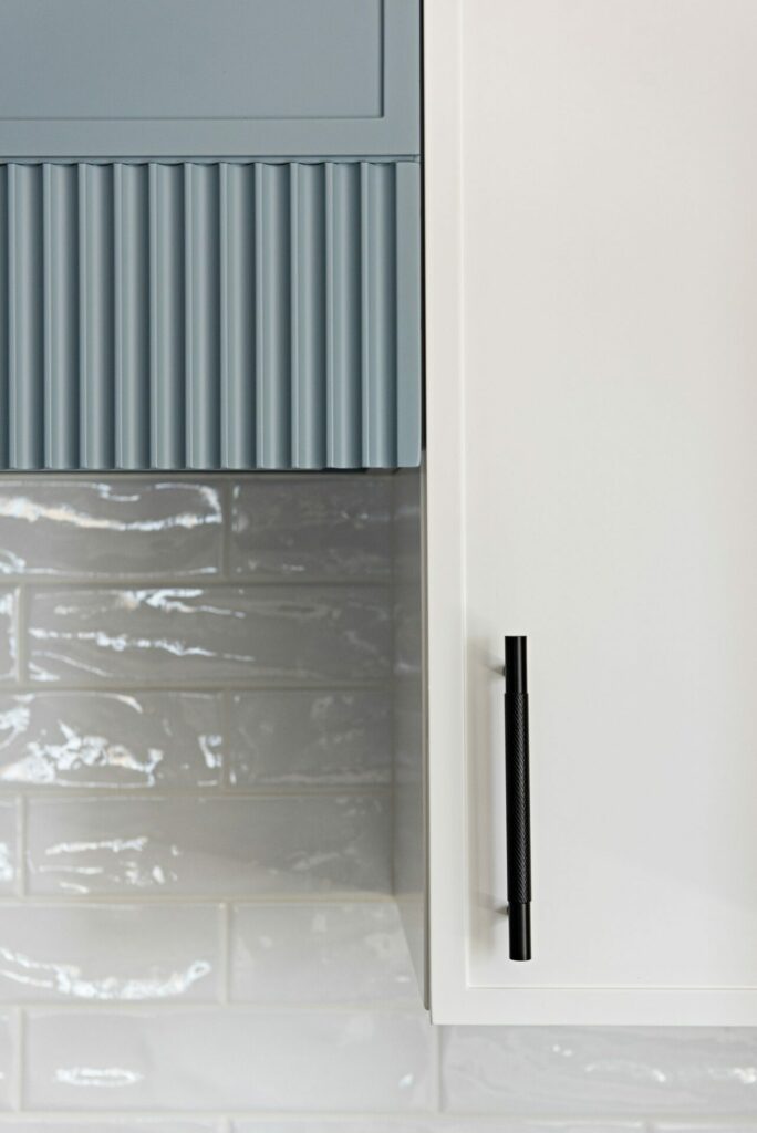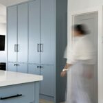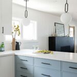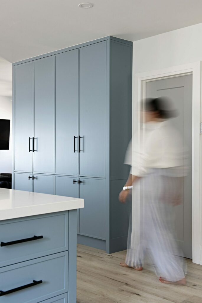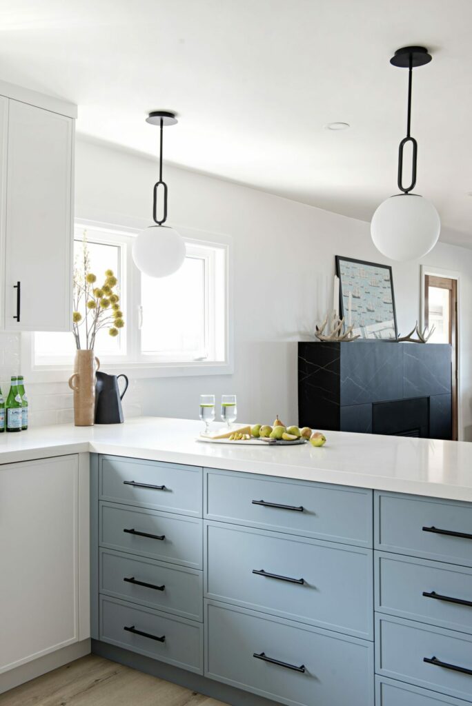 This beach front property was completely renovated and given a new life by Mndesign. This Kitchen was designed to maximize practicality in this small space. black accents and fixtures contrast the white walls and upper cabinetry. The beautiful blue cabinets and pantry in colour Water’s Edge by Benjamin Moore seemed perfectly appropriate in a waterfront cottage.