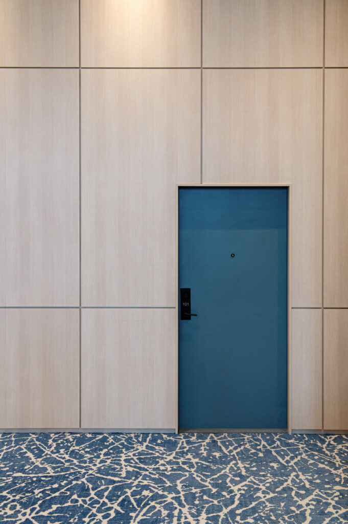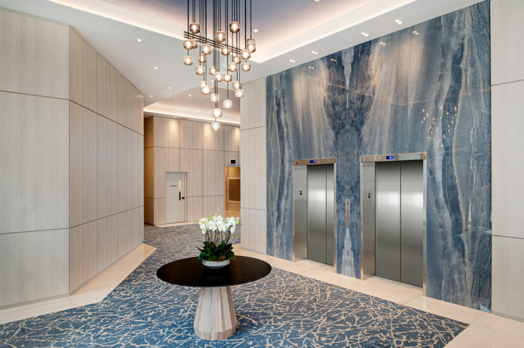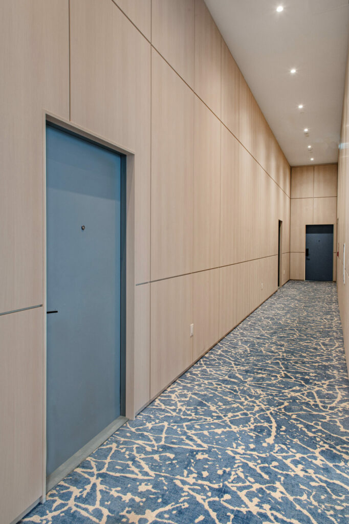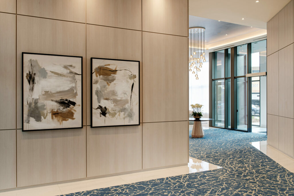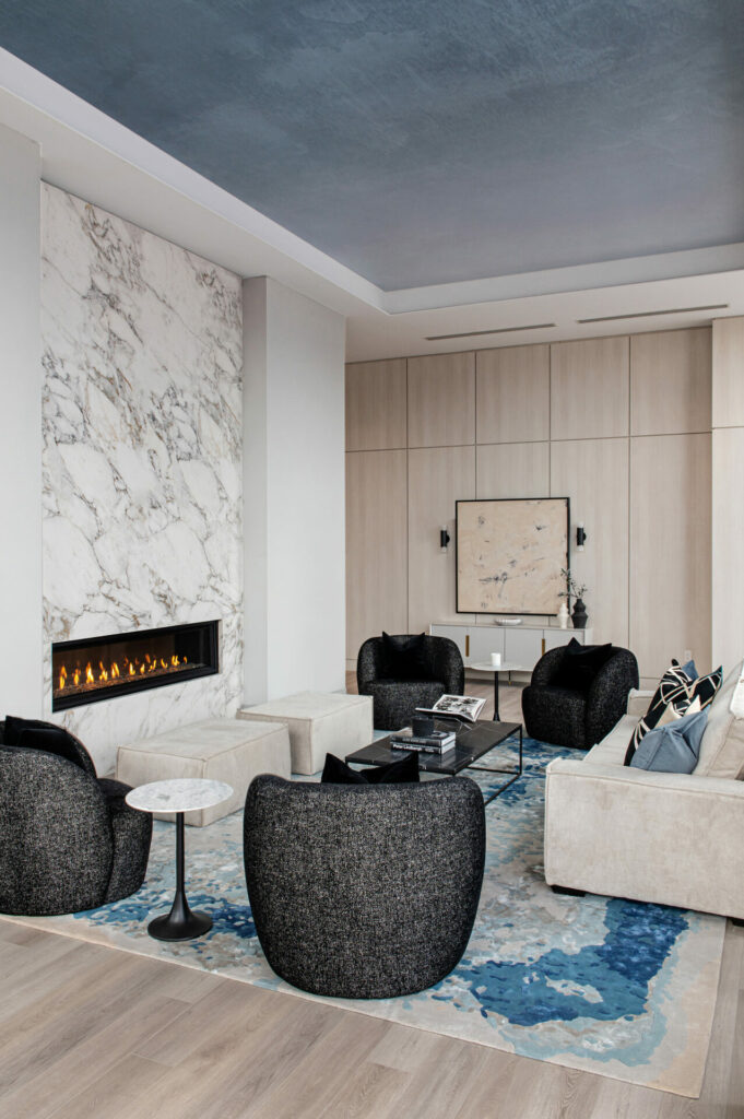 Rise at Stride Condominium, design of the lobby, amenity spaces & corridors by MND. inspired by the waterfront views, we didn’t shy away from colour and drama in this port credit mid-rise.