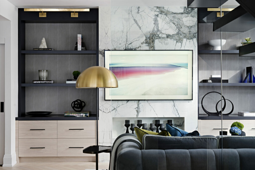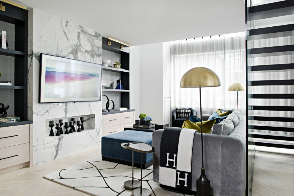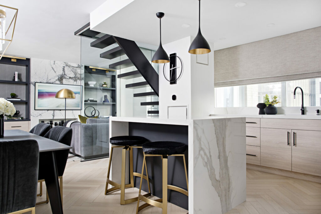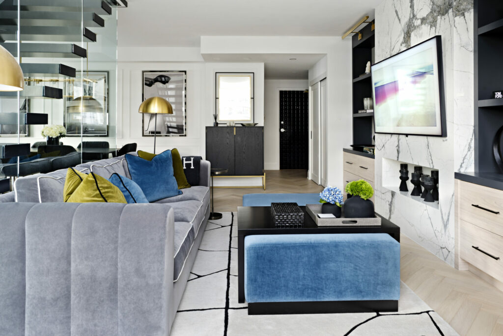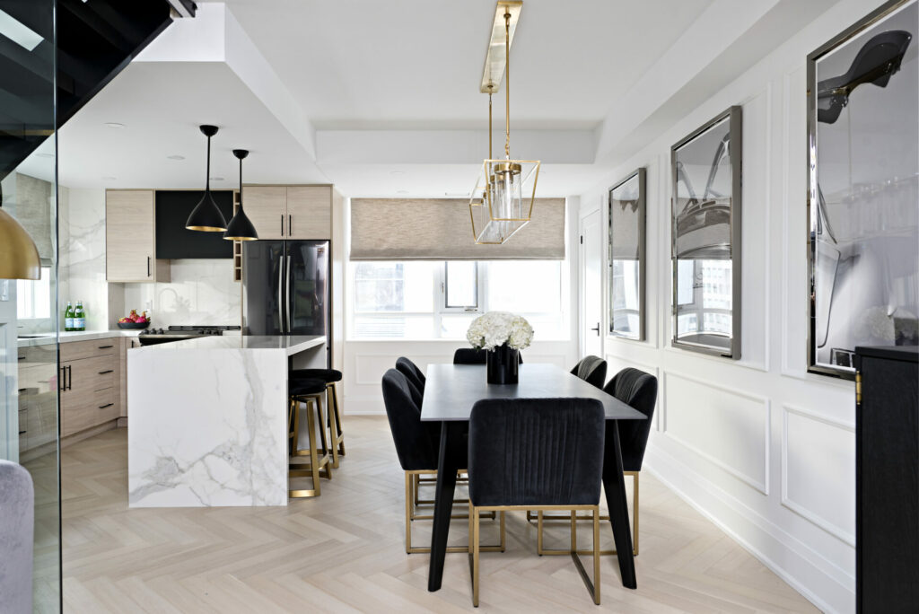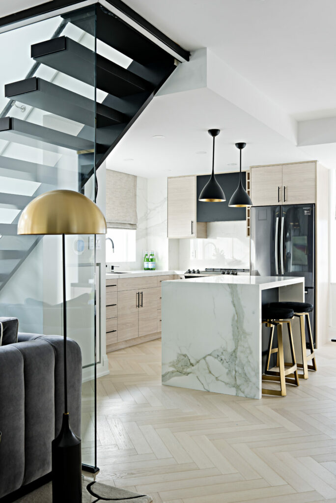 This once dark and dull loft in the heart of Yorkville was completely transformed in a full renovation by MN Design. The young homeowner requested to fully renovate their home to add light and personality using luxurious and highly customized finishes. The use of the light oak herringbone floors throughout made the space feel much larger and brighter along with opening up the kitchen and using the space wisely with storage. The custom media wall was acts as focal point of the main floor while providing smart storage solutions for a tight space. MN Design works with the client to understand their personal style and translates that into custom upholstery, rugs and accents adding colour and unmistakable style and luxury to the space.
