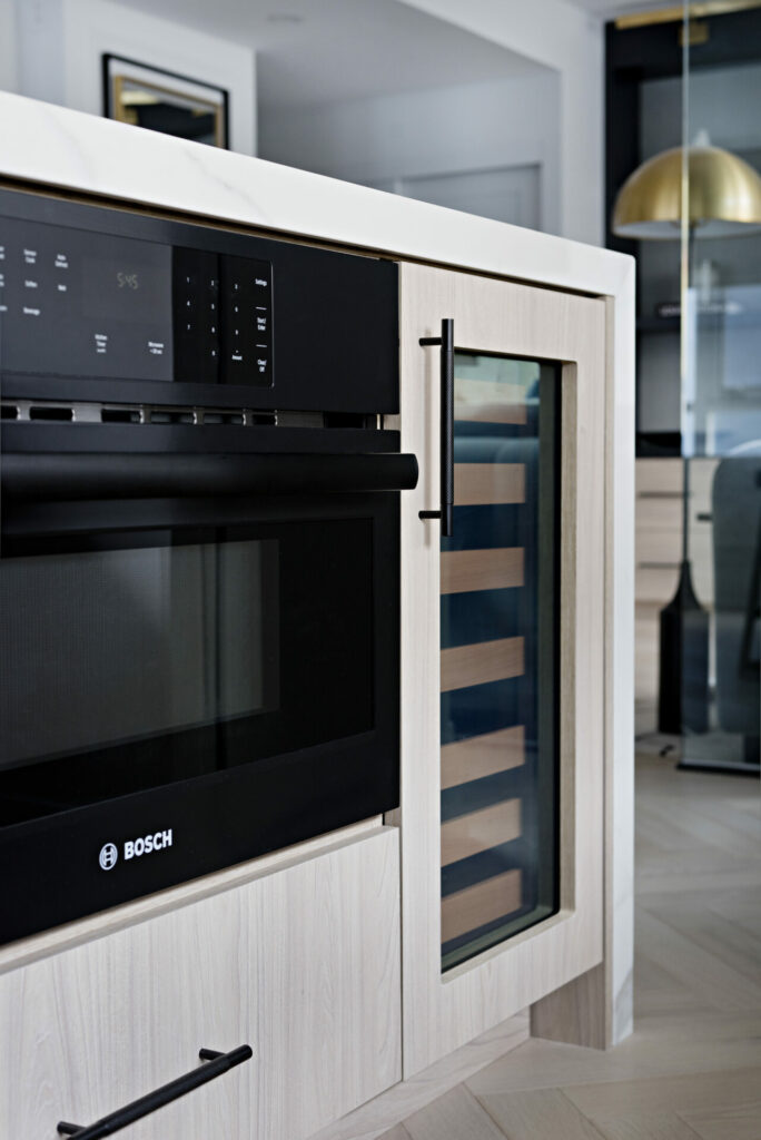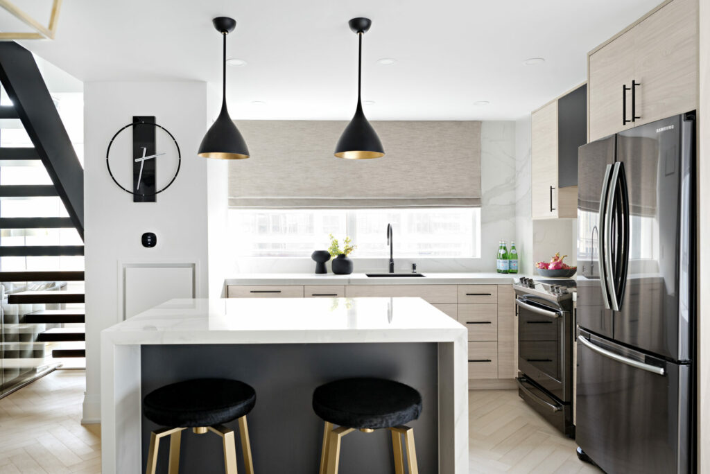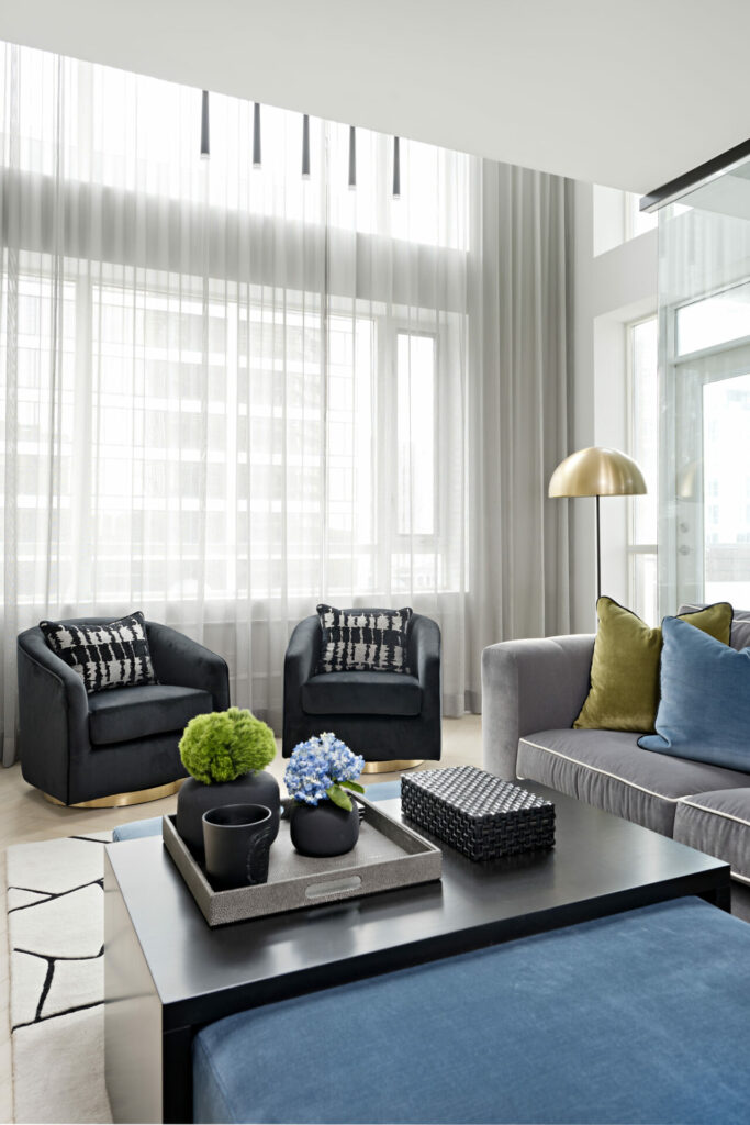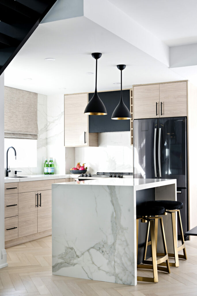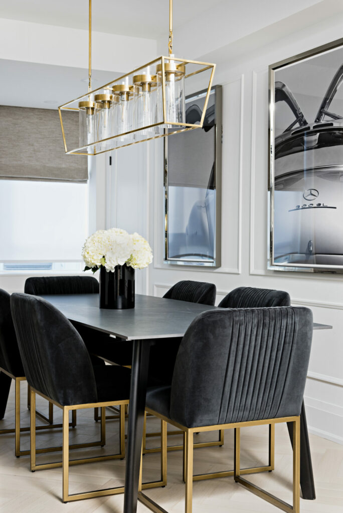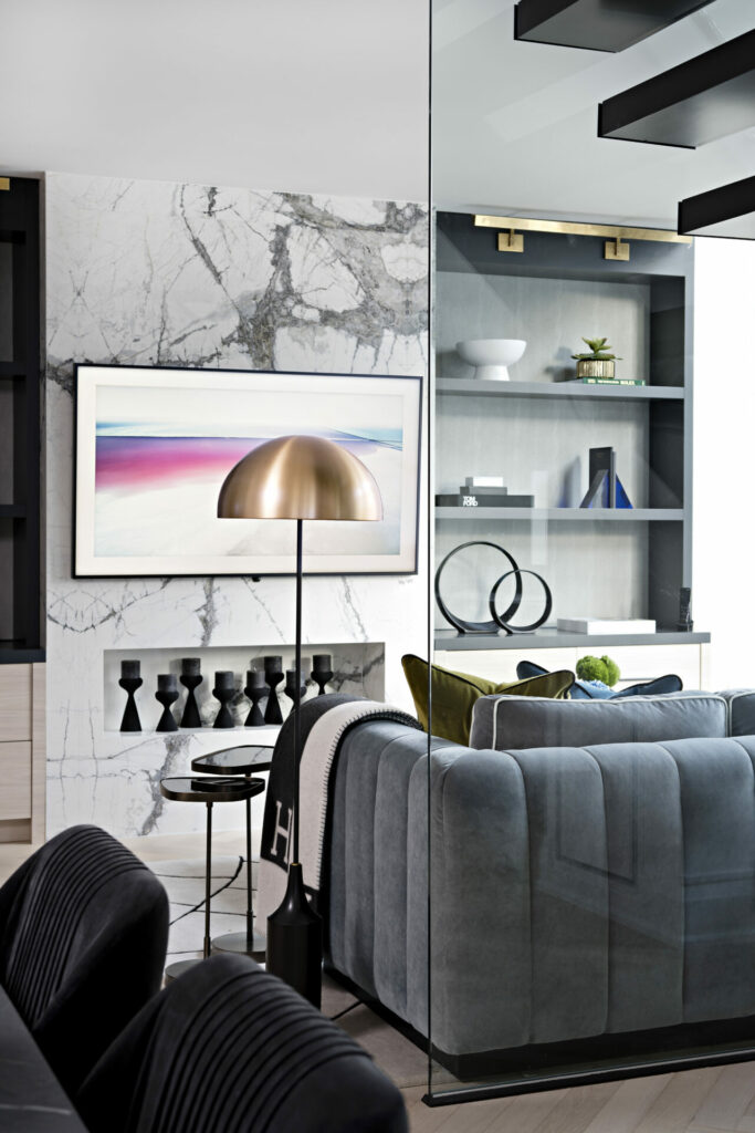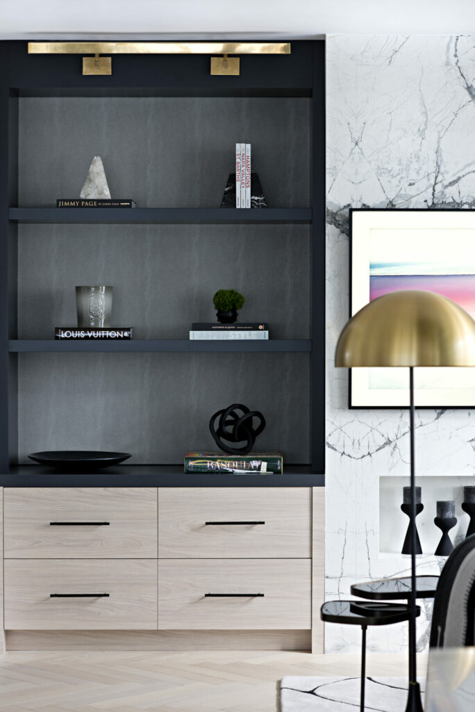 This once dark and dull loft in the heart of Yorkville was completely transformed in a full renovation by MN Design. The young homeowner requested to fully renovate their home to add light and personality using luxurious and highly customized finishes. The use of the light oak herringbone floors throughout made the space feel much larger and brighter along with opening up the kitchen and using the space wisely with storage. The custom media wall was acts as focal point of the main floor while providing smart storage solutions for a tight space. MN Design works with the client to understand their personal style and translates that into custom upholstery, rugs and accents adding colour and unmistakable style and luxury to the space.