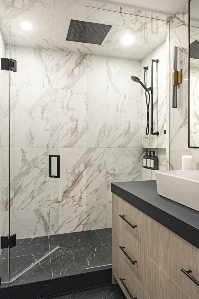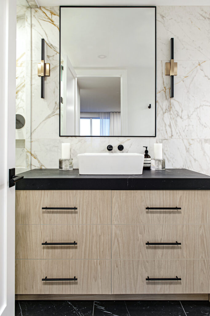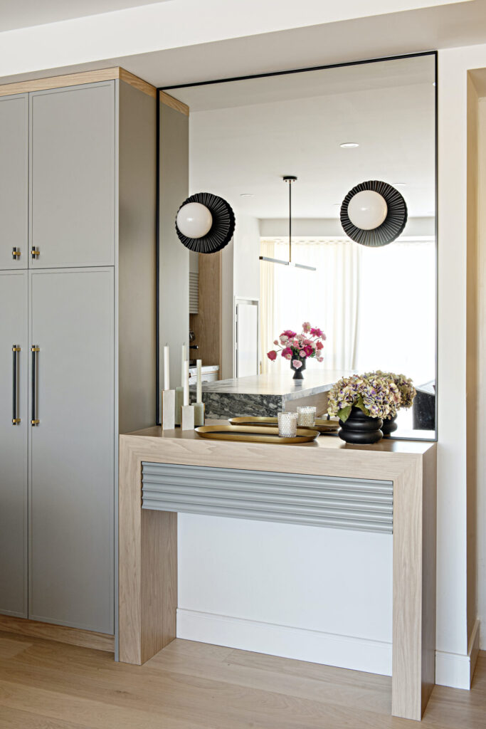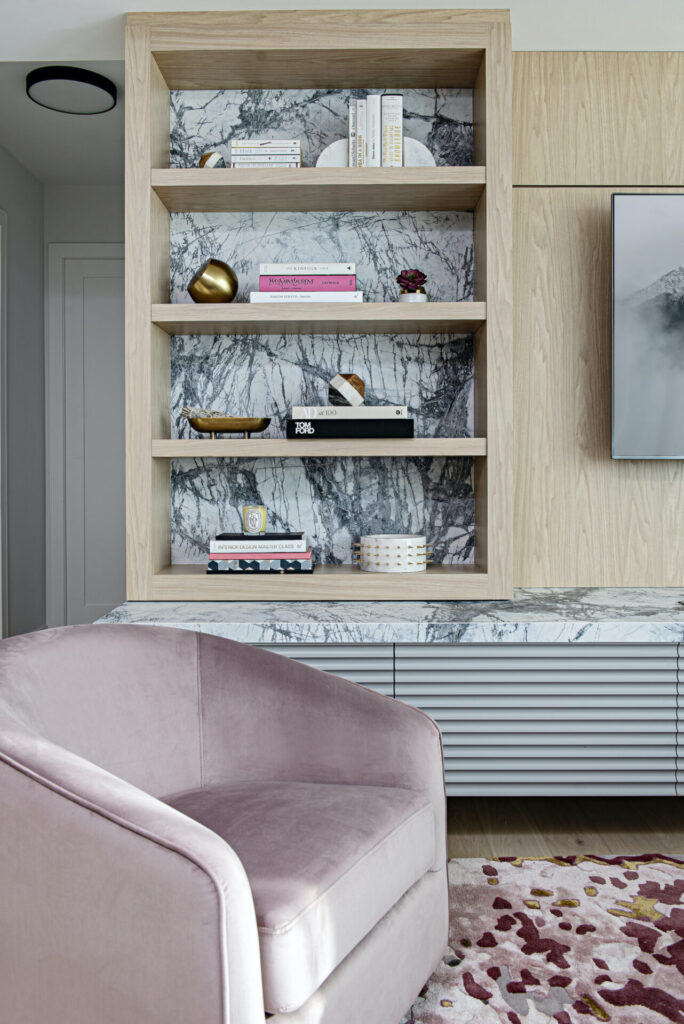 A once builder spec condo completely gutted and transformed into a luxurious, personality filled suite. The two bedroom, two bathroom condominium was transformed into a one bedroom pied-à-terre with lots of custom millwork and fine finishes. The young homeowner wanted the space to unapologetically reflect her own personal taste and style, Mndesign worked closely with the homeowner to interpret her goals and dreams into reality.
